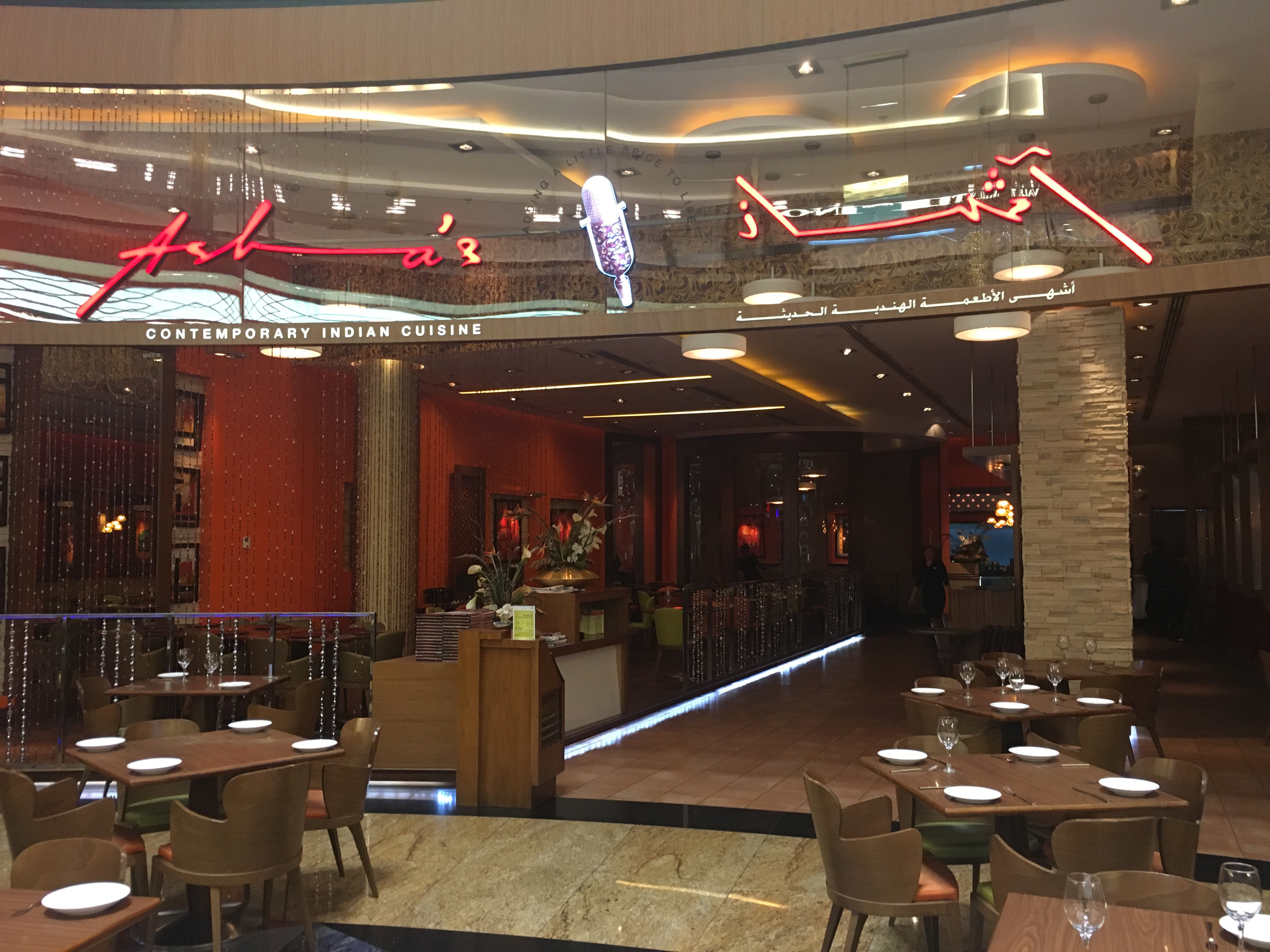 Spacious, comfortable, abstract art and semi dark (more on the dark side) lighting is what creates the ambiance at the restaurant. Even though it is located inside Mall of the Emirates, it does have a lot of seating.