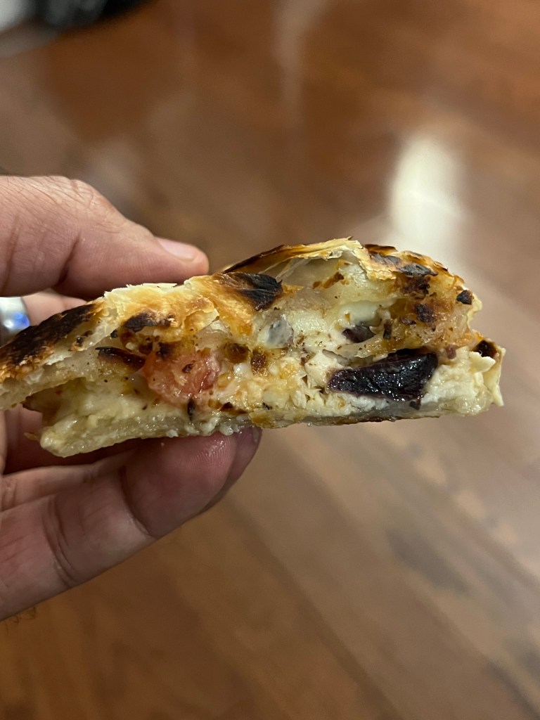 - Top the paratha with shredded roasted chicken, diced tomato, sliced Kalamata olives, and a generous sprinkle of shredded mozzarella cheese.