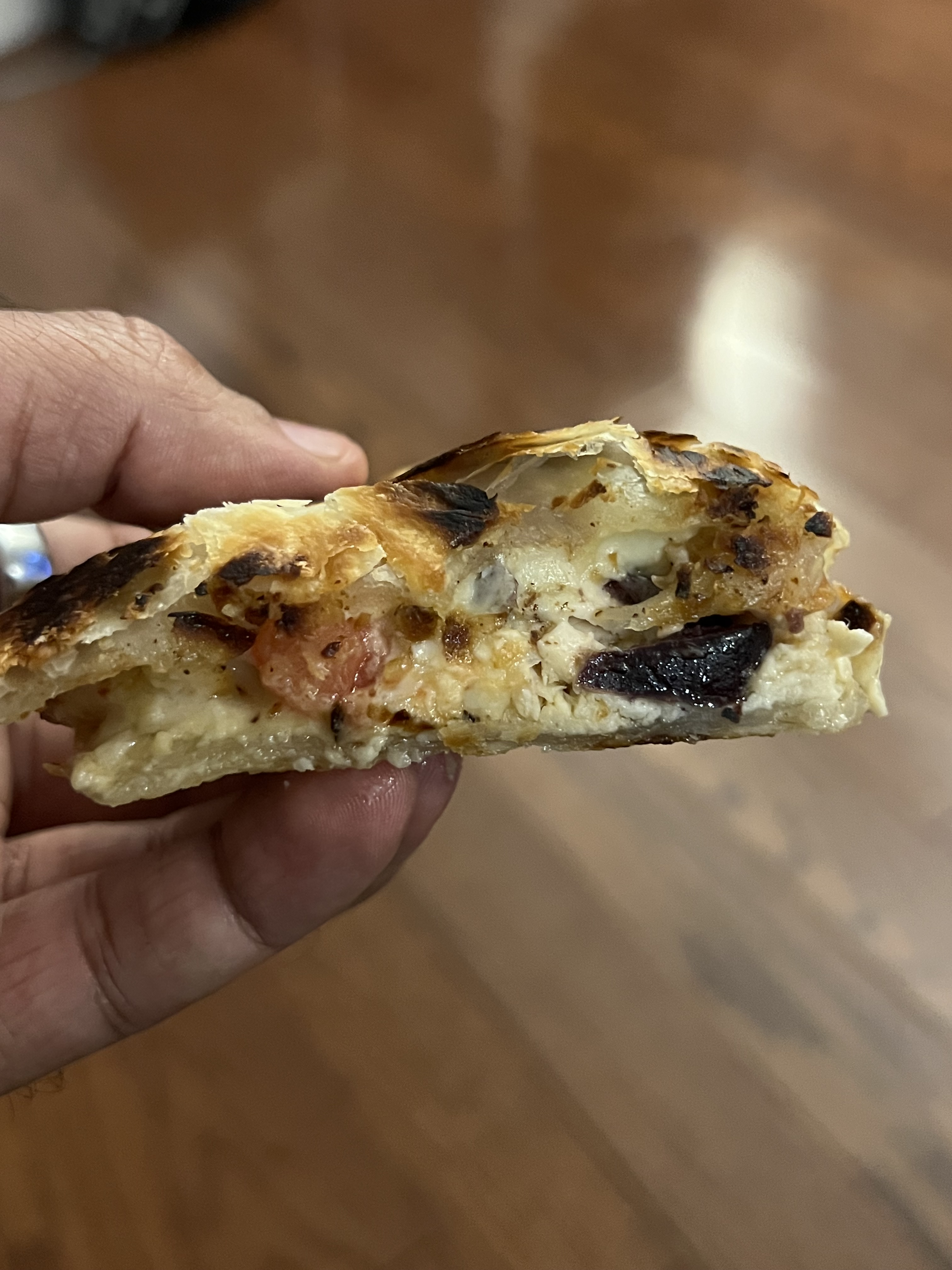 - Top the paratha with shredded roasted chicken, diced tomato, sliced Kalamata olives, and a generous sprinkle of shredded mozzarella cheese.